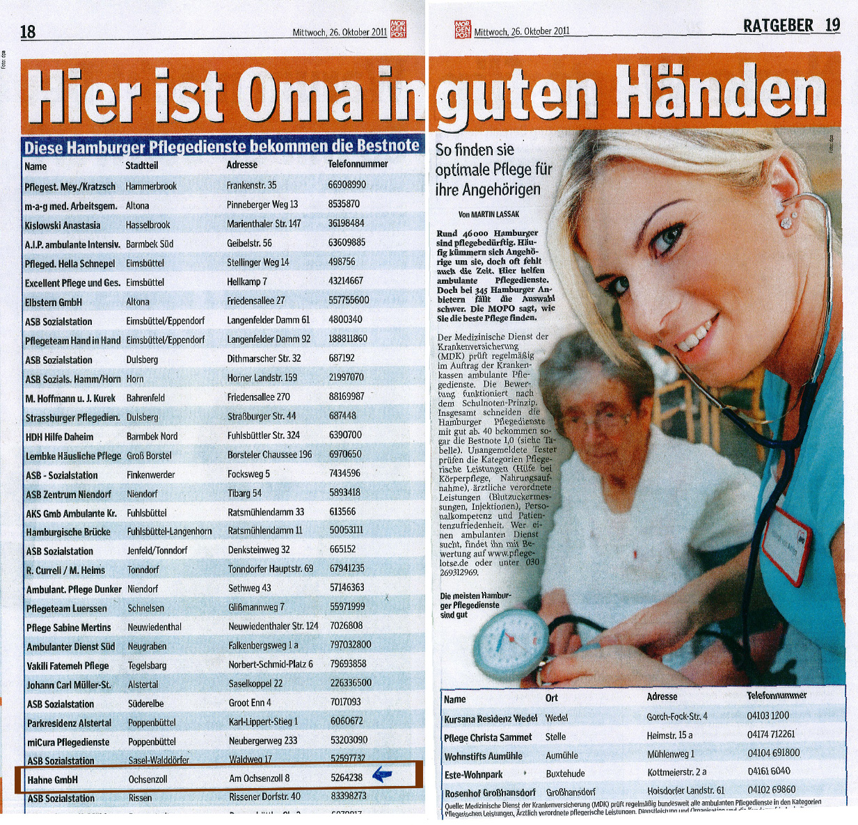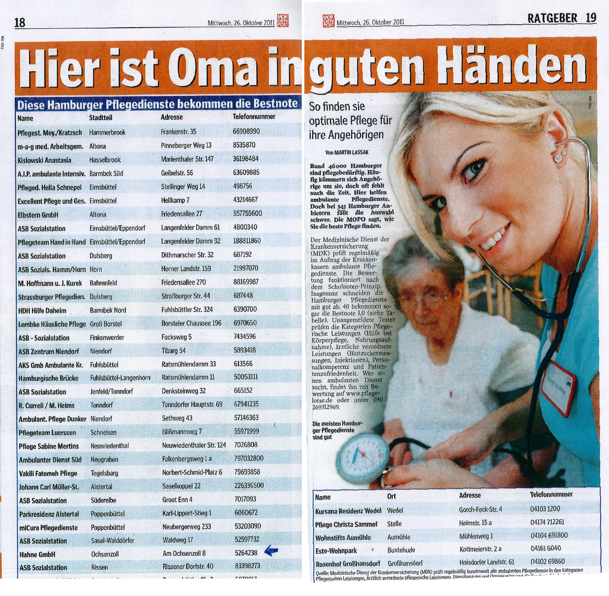 Geprüfte Pflegedienste in Hamburg auf einen Blick. Die Mopo zeigt, welche Pflegedienste mit Bestnoten eine gute und verlässliche Pflege anbieten. Den ganzen Artikel lesen.